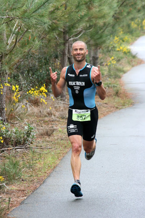 Ma course : prévu pour partir à allure marathon, au feeling, après 500m rapide, je me cale à une vitesse de croisière à ± 3'40/45 ... Là je suis NIC-KEL, quel panard. Jibé est là avec moi. Il y a Nico Norton de Bouliac Tri juste derrière également.